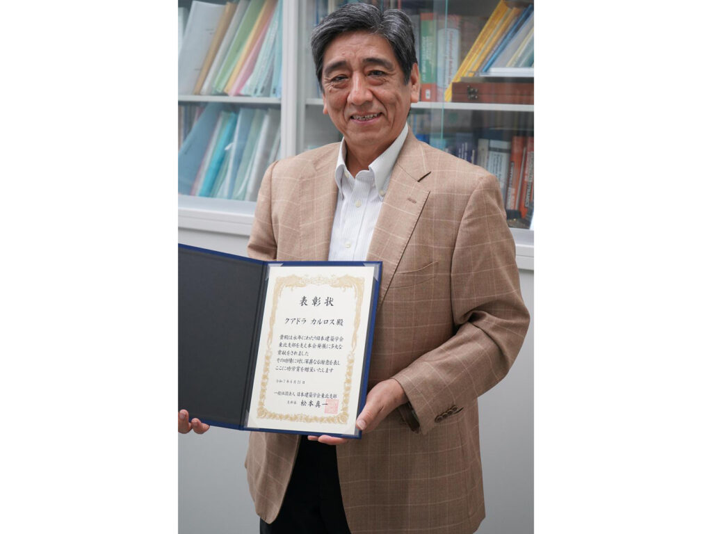 システム科学技術学部建築環境システム学科クアドラカルロス准教授が、日本建築学会東北支部から功労者として表彰されました。 同学会の支部常議員をはじめとして長年にわたり東北支部を支え、学会の発展に寄与された功績に対し、贈られたものです。